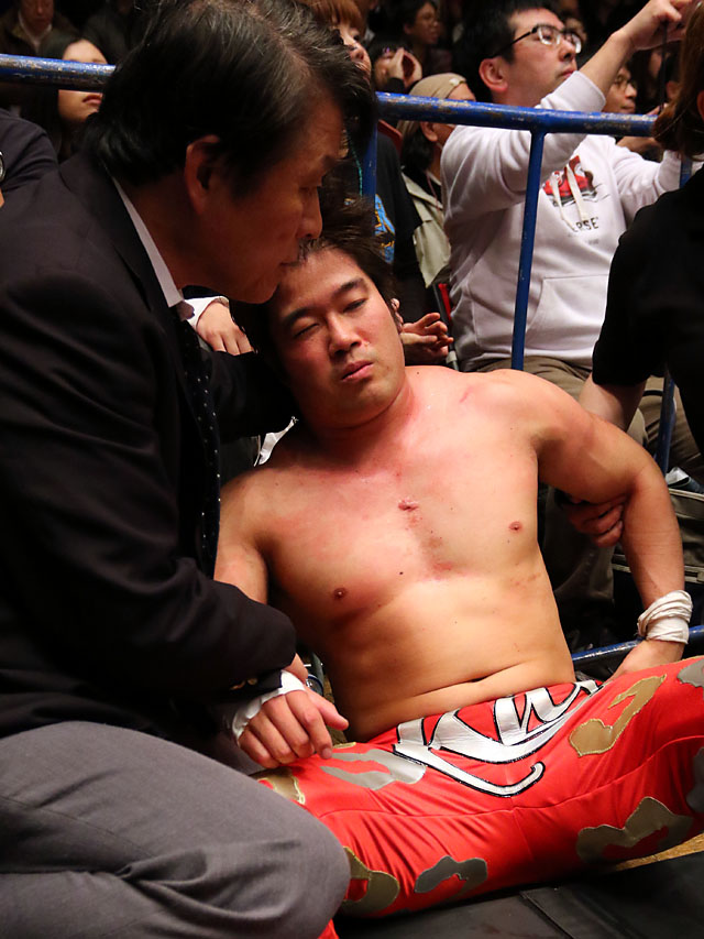 KAI選手が昨日の後楽園大会において脳震盪をおこした為、大事をとり本日の銚子大会、明日の甲府大会を欠場させて頂く事になりました。