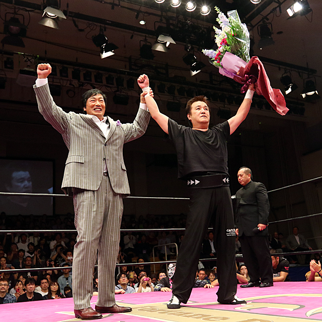キャプチャー王者に介錯された北原だったが、笑顔でS・タイガー、丸藤と抱擁を交わす。2人は先輩の手を掲げてねぎらうと、場内は「北原」コール一色に。小橋から花束が贈呈されると、スペシャルゲストとして北原の師匠である初代タイガーマスクが登場。記念のマスクを贈ると、「北原君、祝引退…といっても、格闘技人生、プロレス人生悔いなくやってこれましたか? その誇りを後輩に託して、皆さんこれからも北原君を応援してください」と弟子をねぎらった。