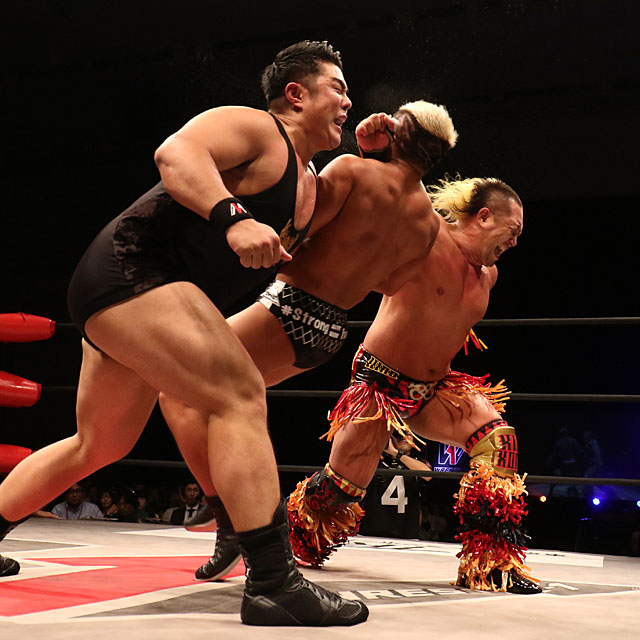 土肥もデッドリードライブ、スパインバスターで逆襲。近藤とのダブルラリアットも叩き込んだが、STRONG HEARTSは連係を駆使して流れを渡さない。T-Hawkが低空ドロップキック、リンダマンがショルダータックルで近藤を蹴散らし、土肥をローンバトルに追い込むと、T-Hawkが雪崩式ブレーンバスターで叩きつけ、リンダマンがダイビングボディプレスを投下する連続攻撃に出る。土肥もハーフネルソンスープレックスで反撃するものの、T-Hawkが飛び込んでニーアッパーをぶち込む。そして、リンダマンがジャーマンで一気に勝負をかけた。