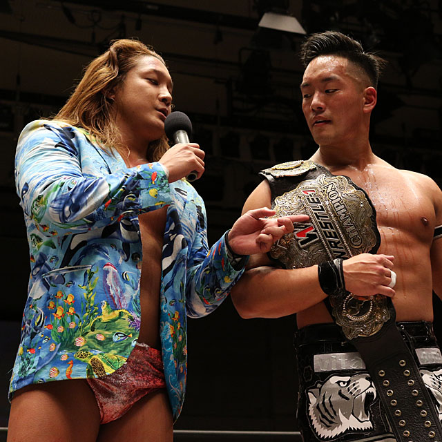 これまでSHにはいいようにやられてきたイケメンが逆転星。大きな「イケメン」コールを浴びると、「まあ、ひとごとで言えばダメージしかないんですけど…。おい、W-1チャンピオン。お前に勝ったぞ」と雄叫び。そして、「お前に挑戦させろ。そのベルトはW-1の人間が巻かなきゃいけないベルトなんだよ。だから、W-1の黒潮“イケメン"二郎がそのベルトに挑戦表明!」と宣言した。