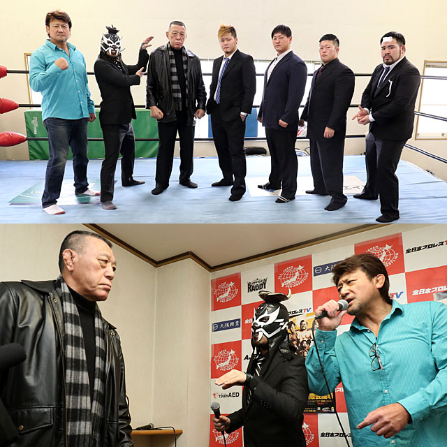 3・21名古屋大会で行われるアジアタッグ王座決定トーナメントへ向けた会見が1日、神奈川・横浜市の全日本事務所で行われ、大森隆男&ブラックめんそーれ、橋本大地&神谷英慶、高橋匡哉&植木嵩行、大日本・グレート小鹿会長が出席。「どこでどんな手を使ってくるのかわからない。また汚い手を使ってくる可能性は十分ある」と警戒する大森に対し、小鹿会長は「正々堂々といきますよ。僕も手出しはしない!」と正攻法を約束し、最古のベルトを大日本に持ち帰ることを予告した。
