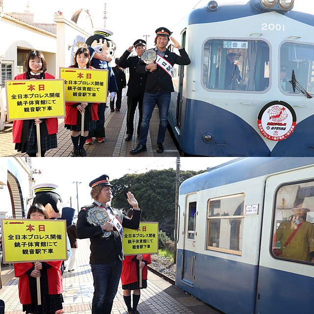 この日の銚子大会は株式会社MIST solution(田代貢一郎代表)協力のもと開催される。同社が銚子電鉄・君ヶ浜駅のネーミングライツパートナーを務める縁で、この日、銚子電鉄と全日本のコラボが実現。電車のヘッドマークに全日本のロゴが採用され、社内も3・9銚子大会の告知ポスターで埋め尽くされた。また、一日乗車券、ヘッドマーク缶バッジなどの「全日本×銚子電鉄」コラボグッズも販売された。