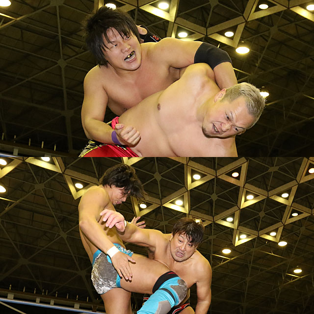 序盤こそ互角のせめぎ合いを展開したが、鼓太郎がキャリアの差をみせつけるように、ローリングソバット連打、ニードロップ、ボディシザースと腹部への集中攻撃で圧倒。串刺しジャンピングニー、地獄の断頭台の連続攻撃に出た。負けじと岩本は起死回生の一本背負いで逆襲。コブラツイストで絞め上げ、ネックスクリューを豪快に決めた。鼓太郎もワンツーエルボーで反撃し、エクスカリバーで突き刺して譲らなかった。