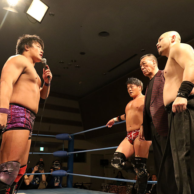 大日本のグレート小鹿会長が5・5横浜文体での飛艶のアジアタッグ再挑戦をアピール。河上と菊田はこの日、組まれた王者・岩本とのタッグ対決で直接勝利を奪って認めさせる構えをみせていた。