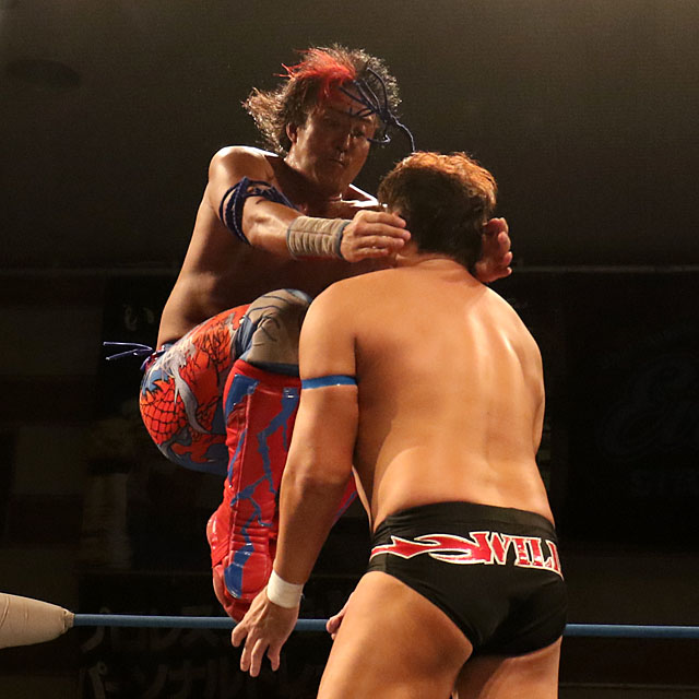 この日は元三冠王者でもある大森との一騎打ちが組まれた。シングル2冠王として負けられない状況の中、ヨシタツは大苦戦。執ようなスリーパーに捕まって消耗し、フロントハイキック連打、スワンダイブ式ミサイルキック、フィッシャーマンスープレックスで反撃しても、バックドロップは決められず。大森のフロントハイキック、ニールキックの連続攻撃で動きが止まり、後頭部へのアックスボンバーを連発されると、雪崩式バックドロップでコーナーから叩き落とされた。