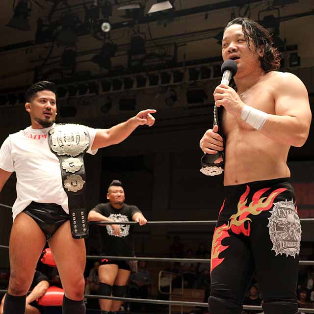 Enfants Terriblesの芦野&児玉は8・1後楽園で近藤&征矢組を破ってタッグ王座戴冠。9・1横浜文体では入江茂弘&エル・リンダマン組を下して初防衛を果たした。そんな2人に元王者の河野&アレハンドロ組が挑戦表明。9・15札幌での前哨戦では8人タッグマッチながら河野が児玉から3カウントを奪って弾みをつけていた。
