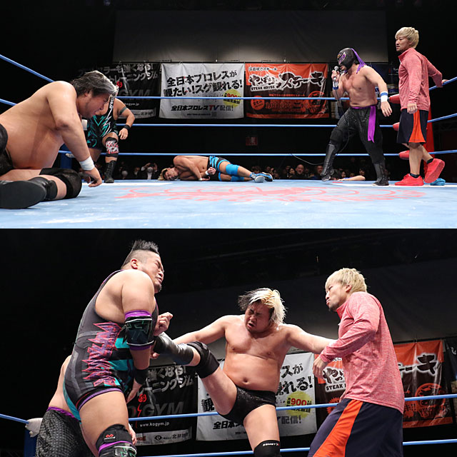 これを拒んだ諏訪魔は乱入してきたUTAMAROも含めて3人を相手取る大暴れ。ラリアットで次々になぎ倒し、入江をスリーパーで絞め上げると、ラストライドで料理にかかったものの、UTAMAROのパウダー攻撃によって妨害された。視界を奪われた諏訪魔はイザナギによって場外に蹴散らされ、その間、パートナーの岡田が入江のキャノンボール、ビーストボンバーを立て続けに食らって沈んだ。