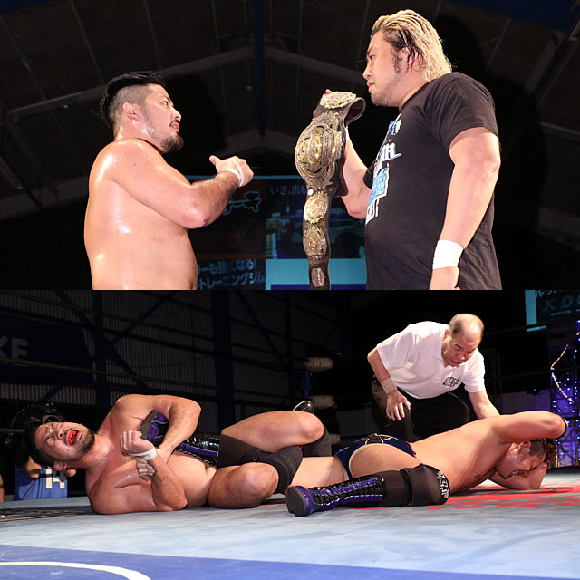 ならばと芦野はエルボースマッシュ合戦に持ち込んだが、青柳がトラースキック、フロントハイキックで競り勝つ。コーナーに上がったところを芦野が雪崩式フロントスープレックスで叩き落とし、青柳のジャーマンも読んでアンクルロックに切り返そうとしたが、さらに先読みした青柳がその場飛びフットスタンプで阻止。トラースキック、ジャーマンでたたみかけられた芦野はピンチに追い込まれた。