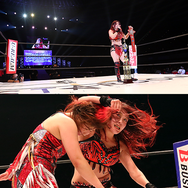 女子プロレスにおいて実に26年ぶりとなった大阪城ホール大会のメインで、詩美が彩羽を30分超えの熱闘の末に突破。ワールド王座V7を果たした。