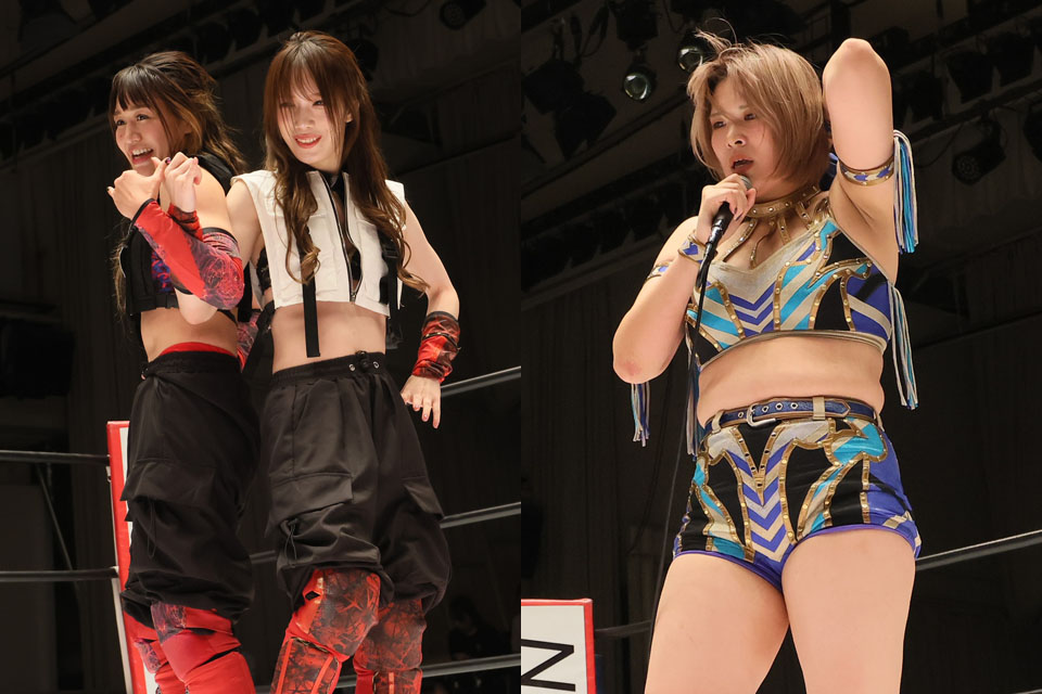 タッグリーグ開幕戦で朱里&鹿島は刀羅ナツコ&渡辺桃に、飯田&HANAKOは白川未奈&月山和香にそれぞれ敗北。両チームともに初白星を目指して公式戦で対決した。