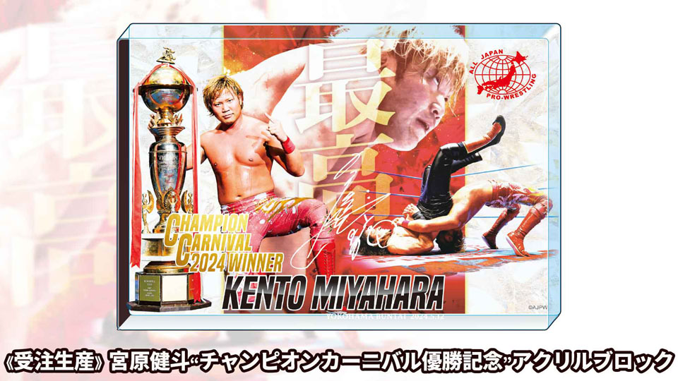 宮原健斗の「チャンピオン・カーニバル 2024」優勝を記念し、アクリルブロックの発売が決まった。全日本プロレスオンラインショップでの受注生産販売で、6月6日12時から16日23時59分まで受け付け。販売価格は6000円となる。