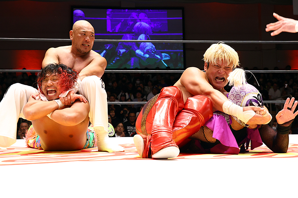 だが、人生はコーナー最上段に上がった剣舞に飛びつき、まさかのスパニッシュフライを敢行。すかさず拳王がPFSを投下したものの、ヒロムのカットが間に合って試合は続行に。ならばと拳王は拳王スペシャルに捕獲。人生が極楽固めでヒロムを足止めし、拳王がギブアップ勝ちを収めた。