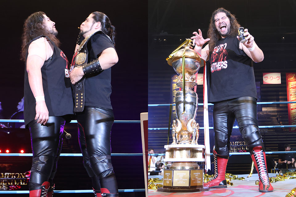 「さすがは宮原健斗。とんでもねえ強敵だった。今までで一番強え相手だったんじゃねえか。正直、最後のほうはダメだと思った。だが、俺自身を強く信じたおかげでこうしてこのトロフィーを手に入れることができたぜ」と宮原との激闘を振り返りつつ、優勝の実感を噛みしめたレイ。6・1仙台大会で行われることが決定的となった三冠戦に向けて、「史上初の双子での、兄弟での三冠戦だ。それも、地元・宮城でだ。メチャメチャ盛り上がるだろうぜ。ただな、やるからにはもちろん俺が勝って、新三冠チャンピオンになるつもりだ。しっかりとジュンをぶっ倒して、あの三冠のベルト、全日本プロレスの至宝のベルトをこの手に次は手に入れてやるぜ!」とベルト奪取を誓ってみせた。