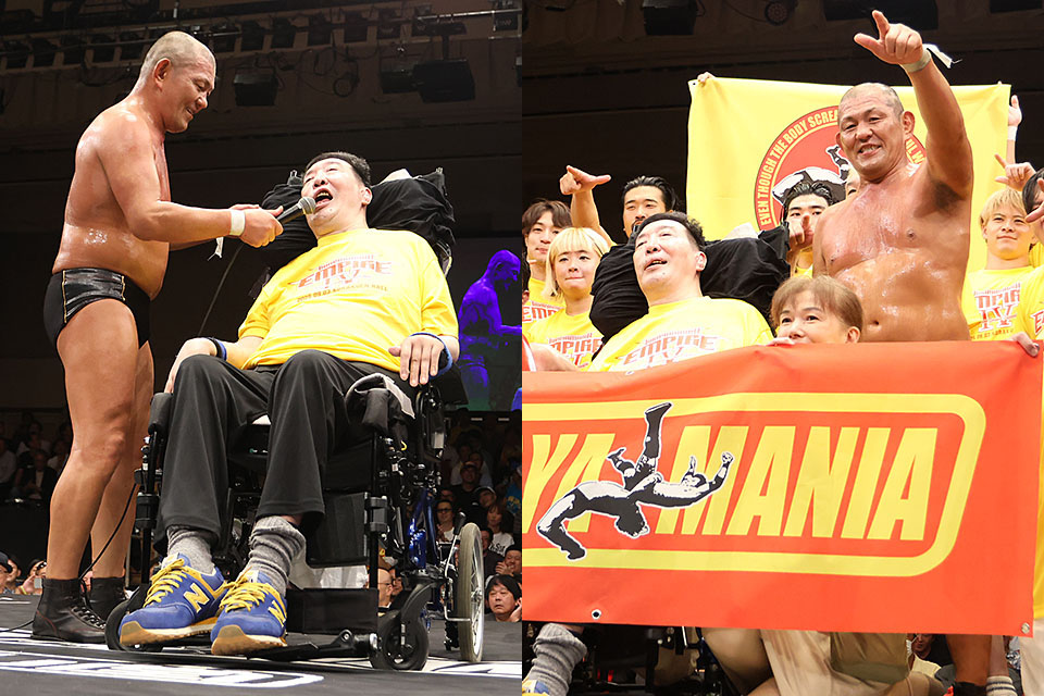 『TAKAYAMANIA EMPIRE IV』後楽園ホール(2025年9月3日) 懸命なリハビリ生活に励んでいる高山善廣が1年ぶりにリングに登場。大「高山」コールを浴びた帝王は、盟友・鈴木みのるに鼓舞されると、「立ち上がって、鈴木みのるをぶちのめしてうれし泣きしたいね」と言い返し、最後は「ノー・フィアー!」の雄叫びで自ら大会を締めくくった。 高山は2017年5月4日のDDT豊中大会で首を負傷。頸髄完全損傷と診断され、首から下が動かない状態になり、リハビリ生活を続けている。帝王を支援すべく鈴木が発起人となって行われているのが『TAKAYAMANIA』。昨年9月に続き、4度目の大会が行われ、超満員札止めの観客が集まった。 高山にゆかりのある選手たちが多数参戦。メインイベントでは高山自身が決めた「鈴木&丸藤正道vs柴田勝頼&KENTA」のカードが実現し、30分時間切れ引き分けの熱戦を繰り広げた。高山はテレビ解説として激闘をリングサイドで見守ったが、4選手はその眼前でチョップ合戦を披露する場面も見られた。 激闘の余韻がリングに漂う中、鈴木に「高山上がって来いよ」と呼び込まれる形で、高山は車イスに乗った状態でリングインした。昨年は7年4ヵ月ぶりにリングに登場し、盟友・鈴木との緊急試合が実現。鈴木のゲキが場内に響く中、決着は持ち越しとなり、高山は涙を見せていた。 あれから1年が経ち、今宵も大歓声で迎えられた。盟友の鈴木に「1年ぶりのリングはどうだ?」と問われると、「いやあ、熱くなるね」と笑顔を見せる。鈴木は「去年の続きはまだ続行中なんだよ。試合中なんだよ。だから、今日は形を変えようと思って。いつも俺が見ている風景、一緒に見ようよ」と提案し、2人だけでリングに立ち、四方の客席から巻き起こる高山コールをリング中央で受け止めた。 鈴木が「どうだ? 弱っただろ」と確認するが、高山は「いや、去年よりちょっとだけ強くなって、もう泣かなくなったよ」と返答。鈴木が「お前の涙は、お前が立ち上がって、俺に負けた時に、悔しいって泣くまで取っとけ!」と鼓舞されても、「いや、立ち上がって、鈴木みのるをぶちのめしてうれし泣きしたいね」と帝王らしく強気に言い返し、大「高山」コールを巻き起こす。鈴木も「返り討ちにしてやる」と通告した。 最後は出場選手やスペシャルゲストもリングに集結。高山による「いくぞ、ノーフィアー!」の雄叫びで大会を締めくくった。鈴木は「これで『TAKAYAMANIA EMPIRE IV』は終了になりますけど、お前らもう1回見たいだろ? たぶんまたやります。また一からやらなきゃいけないからな。大変なんだよ」と次回大会開催を約束。「ポケットに入っている小銭でいいんです。50円でも10円でもいい。募金箱を持って選手みんな出口のところに並ぶんで、入れていってください。お願いします」と呼びかけ、出場選手たちで観客を見送った。 大会終了後、感想を求められた高山は「前回はもう泣きすぎちゃって、感想もまったく言えず、皆さんの顔も見てなかったんで。それぞれ見ると、みんな老けたなと。マスコミの皆さんがあまりにもみんな老けているから笑っちゃいました」と高山節を披露。1年ぶりにリングに上がった感想を「リングはね、もう去年も経験したんで、上げられると思ったから、そんなにビックリしなかったけど、やっぱりあそこから見る風景はいいですね」と満足げに振り返っていた。ファンの気持ちに触れた帝王は過酷な戦いにこれからも挑戦し続ける。 【高山の話】 ――今日の感想は? ▼高山「前回はもう泣きすぎちゃって、感想もまったく言えず、皆さんの顔も見てなかったんで。それぞれ見ると、みんな老けたなと。マスコミの皆さんがあまりにもみんな老けているから笑っちゃいました」 ――柴田選手とKENTA選手はいざこざを起こしていたが? ▼高山「あの2人はどういう組み合わせでもやり合ってくれると思ったんでね。あと、本来は一度も組んでない組み合わせを考えたこともあったんだけど、それよりは何年ぶりかのタッグをやったほうが面白いなと思って。それで今日はやらしてもらいました」 ――テレビの視聴者の皆さんに一言 ▼高山「TAKAYAMANIAいかがでしたか? 皆さんの期待に応えられたらよかったと思います。ではまた、ニコプロで会いましょう」 ――1年ぶりにリングに上がったが、鈴木選手との続きをどんな風に感じた? ▼高山「リングはね、もう去年も経験したんで、上げられると思ったから、そんなにビックリしなかったけど、やっぱりあそこから見る風景はいいですね」 ――気持ち的により火がついた? ▼高山「火はずっとついてたからね。体が燃え上がったね。まあ、それより小橋さんが燃え上がったけど」 ――解説も復活した ▼高山「そうだね、久々に。小橋さんとも言ったけど、解説でタッグができて、それがすごいよかった。まあ、こうやってちょっとずつお客さんの前に顔を見せないと」