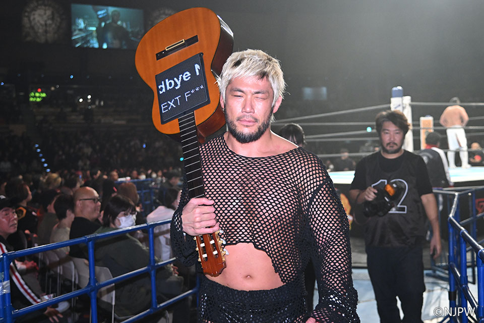 電光掲示板月のギターを片手に、網タイツ風のコスチュームで登場したSANADAだったが、その電光掲示板には「Good Bye NJPW」という意味深なメッセージが映し出された。
