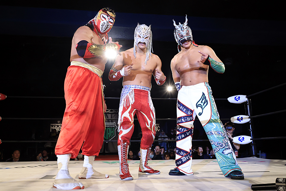 アレハンドロが股間を集中的に攻め込まれて苦もんしたものの、ノータッチトペコンヒーロで歓声を巻き起こせば、ハヤブサも得意のスワントーンボム、ライオンサルトの連続投下で続く。ハヤブサがHAYATAをテキサスクローバーホールドで絞め上げると、キッドとアレハンドロが同時クリストで分断し、マスクマントリオの絞め技競演が決まった。