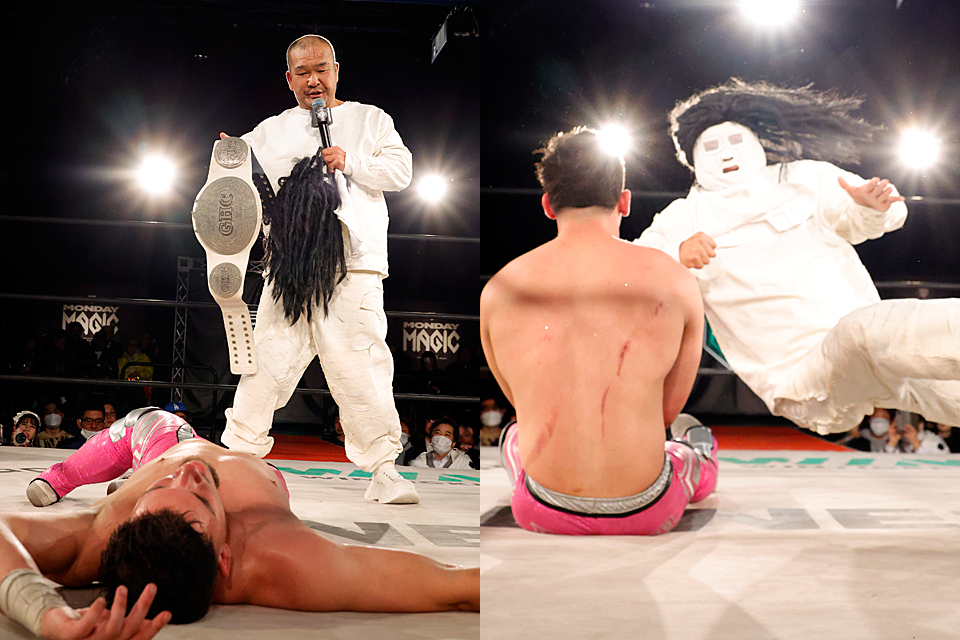 そのままマミーの仮面を脱ぎ捨てると、現れたのは田中将斗。マイクを握った田中は「お前がやってんのはハードコアじゃねえんだよ! 俺が本物のハードコア、お前にみせたるよ。来週、お前が持ってるこのベルト、俺が挑戦する。そして俺が獲るんや」と『RISING SUN SEASON』エピソードファイナルとなる2・9新宿大会での挑戦を表明した。田中はマンマジで復活した白GHCの初代王者。約2年ぶりの返り咲きへ思わぬ形で行動を起こした形となった。