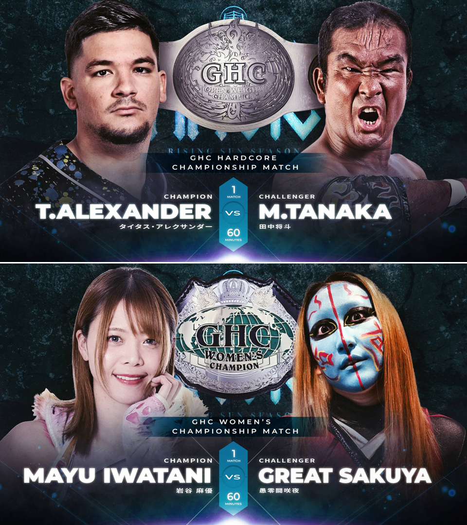 NOAHは2日、『MONDAY MAGIC RISING SUN SEASON』エピソードファイナルとなる2・9新宿大会でGHCハードコア王座戦「(王者)タイタス・アレクサンダーvs田中将斗(挑戦者)」、GHC女子王座戦「(王者)岩谷麻優vs愚零闘咲夜(挑戦者)」を行うと発表した。