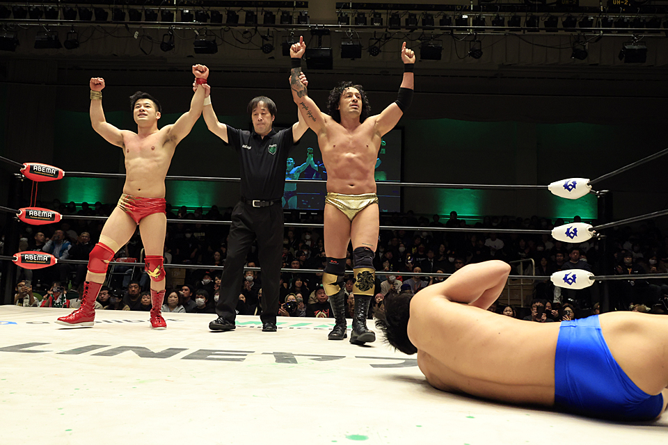 ジュニアタッグ王者として2戦目にしてキッチリ初白星。Eitaにも自身の成長を見せつけた形となった小田嶋は「初戦、落としてしまったけど、ここから巻き返します。ここから全部勝って、このリーグ戦優勝するぞ。僕とダガさん、ロス・イントカブレスが」と誓った。続く2・14品川大会(夜の部)での公式戦では昨年準Vの強豪、マーク・トゥリュー&キーロン・レイシーの英国コンビと対決する。