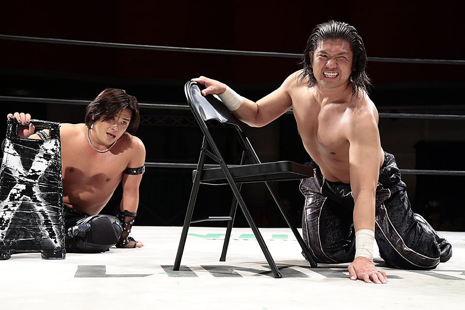 大荒れのTEAM 2000X同門対決でタダスケ&政岡組がウルフ&カイ組を撃破。ジュニアタッグリーグ無傷の3連勝で単独首位に立った。
