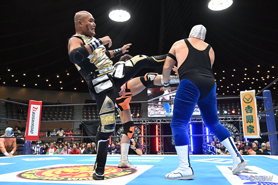 すかさず小島とOKUMURAはダブルフロントキックでジュニアに追撃。アトランティスを捕まえ、小島が串刺しバックエルボー、OKUMURAがOKUMURAカッターの連続攻撃を浴びせる。アトランティスも小島を蹴散らし、OKUMURAに風車式バックブリーカーを連発。ジュニアがOKUMURAにトペスイシーダで突っ込む。アトランティスは小島にフライングボディアタックを発射した。
