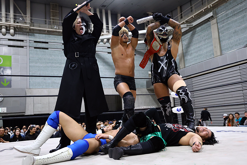 カイの新凶器“デスハンガー"で凄惨勝利を重ねてきたウルフ&カイ組。佳境となったこの日の熊本大会では、Eita&稲畑組と対戦し、Eitaを徹底的に封じて稲畑を捕まえ続けた。終盤には稲畑も気迫の食い下がりをみせたものの、最後はカイが必殺技名でもあるデスハンガーで完璧な3カウントを奪い去った。