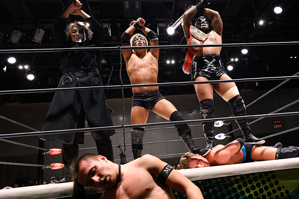 しかし、カイが急行すると、さらにセコンドのヨシ・タツが介入。カイはここぞとばかりに凶器のデスハンガーを持ち込んで、レイシーを絞め上げた。トゥリューが飛び込んで流れを覆そうとするが、T2000Xコンビは暴走ファイトで主導権を渡さず。最後はウルフがパッケージ式パイルドライバーで突き刺して、レイシーを葬った。