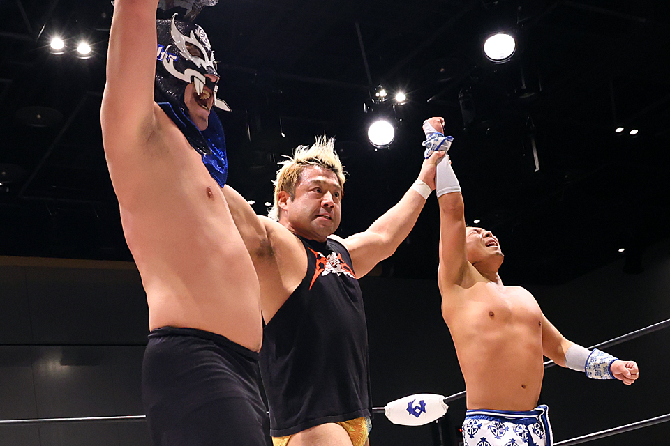 ここでタダスケがレフェリーの足を引っ張ってカウントを妨害。無法地帯となると、政岡が清掃看板でAMAKUSAを殴りつけ、必殺のAmbitionsへ。しかし、AMAKUSAはこれを決めさせず、トラースキックを食らって棒立ちになりながらも、めんそーれが連日見せてきた情熱グラウンドコブラでクルリ。逆転の3カウントを奪った。