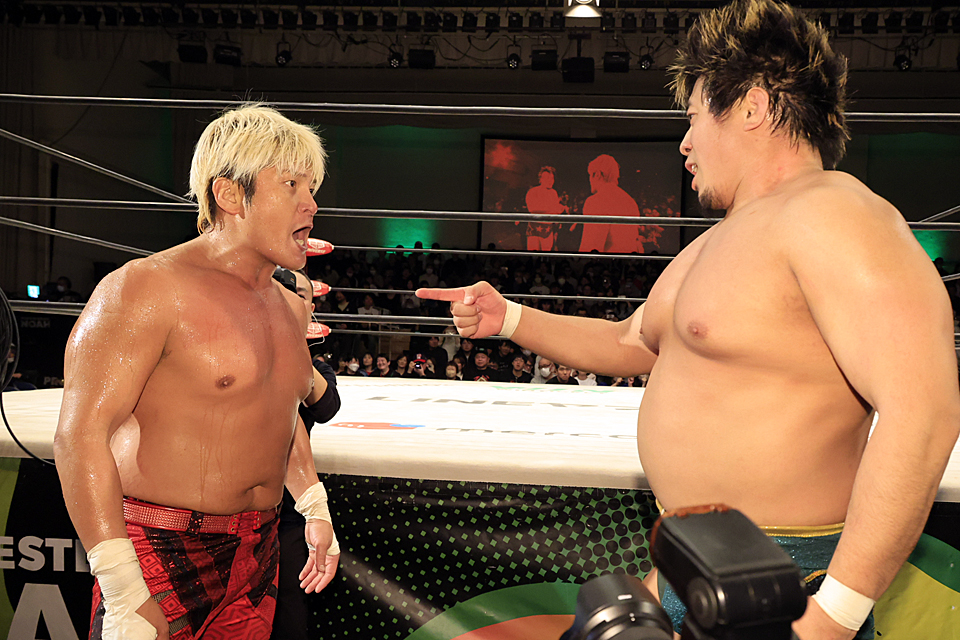 3・8横浜武道館大会のGHCヘビー級王座戦「(王者)Yoshiki vs 拳王(挑戦者)」に向けた最後の前哨戦で、尖(とが)りまくった拳王が降臨。内藤哲也人気が目立つNOAHマットの現状に強烈な問題提起を投げかけたうえで、王者Yoshikiの“闘争心"を煽りに煽った。
