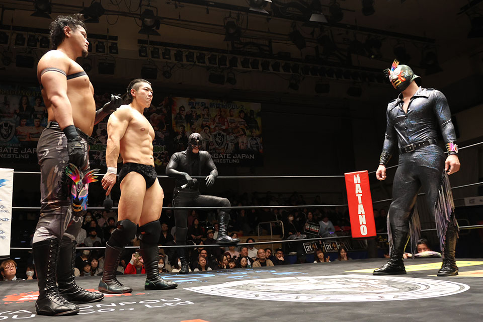 『GLORIOUS GATE 2026』後楽園ホール(2026年3月3日) 6人タッグ3WAYマッチ勝ち残り戦 ○マサ北宮&杉浦貴&タダスケvsBIGBOSS清水&箕浦康太&加藤良輝vsシュン・スカイウォーカー&帆希&エル・シエロ× 遺恨を引きずるシュンと清水、シエロと加藤が大舌戦を展開。決着を付けるべく斎藤了GMが決断し、4・26名古屋大会でマスクと髪の毛を懸けた金網4WAY戦が行われることが電撃決定した。 我蛇髑髏と抗争中のPSYPATRAは、人員不足を補うべく、シュンがOZAWAとのコネクションを活かして、2・23博多大会にプロレスリング・ノアのTEAM 2000Xに所属する杉浦と北宮を招聘。PSYPATRAとT2000Xが共闘して、我蛇髑髏との全面対決に臨んだ。 試合はシュンが清水を丸め込んで連合軍の勝利となったものの、試合中のシュンと杉浦の誤爆をきっかけに、たった1試合で亀裂が発生。清水が「そんなゴチャゴチャ言うんやったら、誰が強いか決めたらええんや」と宣言し、我蛇髑髏、PSYPATRA、T2000Xの3WAY6人タッグ戦が行われる運びとなった。 当初は我蛇髑髏のメンバーとしてISHINの名前が挙がっていたが、2・28大阪大会で帆希に敗れた箕浦が半ば強引に交代させて出場することが決定。T2000Xのタダスケはデビュー前に闘龍門に所属していた時期があり、DRAGONGATEには大阪プロレス所属時代の2010年以来、約16年ぶりの参戦となった。 3軍が揃うと、のっけからリング上は大混戦に。帆希のトペコンヒーロを合図に場外戦になだれ込むと、後楽園ホール全体を使っての大乱闘に発展した。戦場がリングに戻り、一時的に正攻法と競り合う場面が何度かあったものの、そのたびに場外戦に再び発展して、大荒れの展開が続いた。 そんな最中、特に激しくやり合ったのが加藤とシエロだ。1・18後楽園大会では加藤がシエロのマスクを剥いで、「正体わかったぞ」と告白。対するシエロも2・5後楽園大会ではイス攻撃で加藤を報復KOし、後楽園大会で遺恨が激化してきた。この日も加藤がシエロのマスク剥ぎを狙うと、戦いは一気にヒートアップする。 ここで帆希の顔面に水を噴射した箕浦は大技を狙っていく。帆希が反撃を狙ってもセコンドについたISHINが足をすくって介入した。鉄板攻撃まで仕掛けたものの、帆希が避けると、箕浦に痛恨の誤爆。すかさず帆希が押さえ込んで、まずは我蛇髑髏が脱落となった。 T2000XとPSYPATRAの2チームだけになっても、再び場外乱闘に突入。北宮がシエロをいたぶり、ハンマーロックに固めた状態で鉄柱に叩きつけてから、場外カウントが続く中でリングインする。シエロも戻ろうとしたところですでに脱落していた加藤が鉄板攻撃を浴びせて妨害。そのまま20カウントが数え上げられ、T2000Xのリングアウト勝ちとなった。 勝利した北宮は、なおも乱闘する我蛇髑髏とPSYPATRAを見てあきれ顔。マイクを持つと、「おい、いつまでやってんだ、バカ野郎。試合は終わってんだ。あのな、お前たち、PSYPATRAがピンチだって言うからTEAM2000Xとして助けに駆けつけたが、博多で恩を仇にして返された。三つ巴で決着を付けようとしたら、こうやってぶち壊しだ」と両軍を批判する。そして、「よかれと思って助けに入った善意の第三者が被害を被るというそんな世の中ではいけないんだよ」と真っ当な主張をぶち上げると、これには観客も拍手。北宮は「俺も、ゴッドファーザー杉浦貴も、タダスケもNOAHで忙しいから、お前たちと関わるのは金輪際おしまいだ。理解してください。いいか、お前ら。一生死ぬまでやってろ」と三下り半を突きつけて、T2000Xの3人はリングを去っていった。 なおも収まらない加藤はT2000Xが去ったあとのリングにシエロを押し込み、またもマスクを剥ぎを強行。セコンドが飛び込んで、タオルで素顔を隠したものの、マイクを持った加藤は「この間も言ったけどな、俺はお前の正体知ってるぞ。今この瞬間、ここで言ってやってもいいけどな。なぜだろう、エル・シエロ。お前とは正々堂々ケリをつけなきゃってそう思うんだ。そこでだ、エル・シエロ。お前はそのマスクを、俺はこの髪を…。この俺とマスカラ・コントラ・カベジェラやるぞ」と要求した。 シエロもマイクを手にする。昨年の12・16後楽園大会と同じように、シュンが「加藤良輝、お前は何もわかってない」と腹話術方式で代わりに喋ろうとするが、それを止めたシエロは、肉声を披露し、「加藤良輝、お前のその汚え手で俺のマスクに触るな。お前なんかが触っていいマスクじゃねえんだよ。お前がそんなにやりてえなら、わからせてやるよ。マスカラ・コントラ・カベジェラやってやるよ」と受諾した。 慌ててシュンが「加藤良輝の髪の毛と、エル・シエロのマスク、それが対等なわけないだろう」と止めに入るも、そこに待ったをかけた清水が「おい、シュン。お前がな、マスクのこと語るんちゃうぞ、コラ。先月の後楽園ホールで、自分からマスクを脱いで反則勝ち。先週土曜日の大阪ではよ、シエロのマスクを取って反則勝ちやぞ。そんなマスクを何回も何回も外す