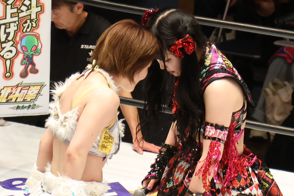 『STARDOM NIGHTER in KORAKUEN 2026 Apr.』東京・後楽園ホール(2026年4月8日) ○安納サオリ&なつぽい&水森由菜vs葉月&伊藤麻希&フワちゃん× なつぽいが伊藤が持ち込んだ“かわいい・オブ・かわいい"ベルトをまたまた破壊。さらに、伊藤が投入した巨大ボード“かわいいスター"を奪い取り、それを脳天に振り下ろしてKOした。 3・31後楽園大会において、なつぽいが伊藤が持つお手製のかわいい・オブ・かわいいベルトを破壊して遺恨がぼっ発し、4・26横浜アリーナ大会での一騎打ちが決定。伊藤はベルトを修繕したものの、4・5浜松大会でもなつぽいは再びベルトを引き裂き、因縁が深まっていた。 この日は前哨戦として、COSMIC ANGELSのなつぽい&安納&水森と、葉月&フワちゃん&伊藤が対戦。伊藤はまたもかわいい・オブ・かわいいベルトをテーピングで補修した状態でリングに持ち込んだ。 注目の伊藤となつぽいの対戦はなかなか実現しなかったが、いざ対峙すると、伊藤は顔面を蹴りつけて怒りをぶつけ、スイング式DDTで叩きつける。なつぽいもスピーディな動きでかく乱し、顔にドロップキックを放って譲らず。伊藤はスピンキックをヘッドバットで迎撃する石頭ぶりを発揮。なつぽいもトラースキックを的確に見舞ったものの、伊藤は豪快な頭突きを顔面に叩き込んで両者大の字に。 その後、フワちゃんと安納が激しくやり合ったが、安納がフワちゃんを攻め込むと、なつぽいはぽい捨てジャーマンで伊藤を分断し、勝利をアシストした。 試合後、安納がマイクを持つと、伊藤も続き、「おい、“あくぽい"、お前、このかわいいベルトに興味はなくて、この伊藤麻希に興味があると言っていたが、甘えんだよ。いいか、このかわいいベルトを含めて伊藤麻希だ。何度だってぶっ壊してみろ。何度だって生き返ってやる。これが伊藤のやり方だ! これが伊藤麻希だ!」と叫んだ。 だが、なつぽいは「だとしても、結果は同じなんだ、コラ」と言い返すと、かわいい・オブ・かわいいベルトを強奪して、またまた破り捨てて破壊。ブーイングが飛んでも構わず、客席に投げ捨てた。 怒りに震える伊藤はリング下から「かわいい」と刻まれた巨大な星形ボードを取り出す。そして、ロープに乗って観客にアピールしているなつぽいを背後から殴りつけた。「伊藤」コールが発生すると、怒ったなつぽいはかわいいスターを殴りつけるも、硬くて破壊できない。ならばとボードを強奪し、伊藤の脳天に振り下ろしてKOした。 ブーイングが再び起こるが、大の字になった伊藤を放置して、なつぽいを颯爽とリングをあとに。意識を取り戻した伊藤は、葉月にベルトの行方を確認し、なつぽいのあとを追いかけていったものの、かわいいスターは取り戻せなかった。 なつぽいはかわいいスター片手にコメントスペースに登場。「なんだこれは? 暇なのか? 伊藤麻希は。こんなデカいのを。しかもさ、メッチャ硬いんだよ、こいつ」と何度もボードを叩く。それでも気持ちはさらに高まったようで、「私は伊藤麻希に興味があるよ。でも、ベルトも合わせて伊藤麻希って言うんだったら、私もどんどんどんどんどん燃えてきてるんだよ。このちょうどいい硬さ。この硬さでサンドバックにしてトレーニングしてやるよ。見てろよ、伊藤麻希。何度でもやってやるからな」と荒々しくアピールしてみせた。 一方、伊藤はコメントスペースで「伊藤のかわいいベルトが取られてしまった…。せっかく8時間かけて作ったのに。伊藤のかわいいベルトが取られてしまった…。もう伊藤は傷心中で何も言葉が出てこない」と意気消沈。それでもかわいいスターを「伊藤のかわいいの執念の塊」と評すると、再び気持ちが燃え上がり、「伊藤はお前のためなら何時間だって時間を割く。なつぽいどこだ? 許さん。伊藤のベルトを返せ。伊藤のかわいいの執念も返せ」となつぽいの姿を探し回っていた。 【試合後のなつぽい&水森】 ▼なつぽい「(かわいいスターを持って現れると)なんだこれは? 暇なのか? 伊藤麻希は。こんなデカいのを。しかもさ、(叩きながら)メッチャ硬いんだよ、こいつ」 ▼水森「音が」 ▼なつぽい「もう手が折れるかと思ったわ。でも、私は伊藤麻希に興味があるよ。でも、ベルト(何度も叩きながら)も合わせて伊藤麻希って言うんだったら、私もどんどんどんどんどん燃えてきてるんだよ。このちょうどいい硬さ。この硬さでサンドバックにしてトレーニングしてやるよ。見てろよ、伊藤麻希。何度でもやってやるからな。ばいぽい!」 ※なつぽいが去っていくと ▼水森「悪い意味でやばすぎる〜」 【試合後の伊藤】 ▼伊藤「伊藤のかわいいベルトが取られてしまった…。せっかく8時間かけて作ったのに。伊藤のかわいいベルトが取られてしまった…。もう伊藤は傷心中で何も言葉が出てこない。何も言えない。でも、今日記者の人が多いから、何か伊藤答えてあげるよ。はい、どうぞ。質問があれば。早く言えよ、お前ら! おい、何だお前、言え」 